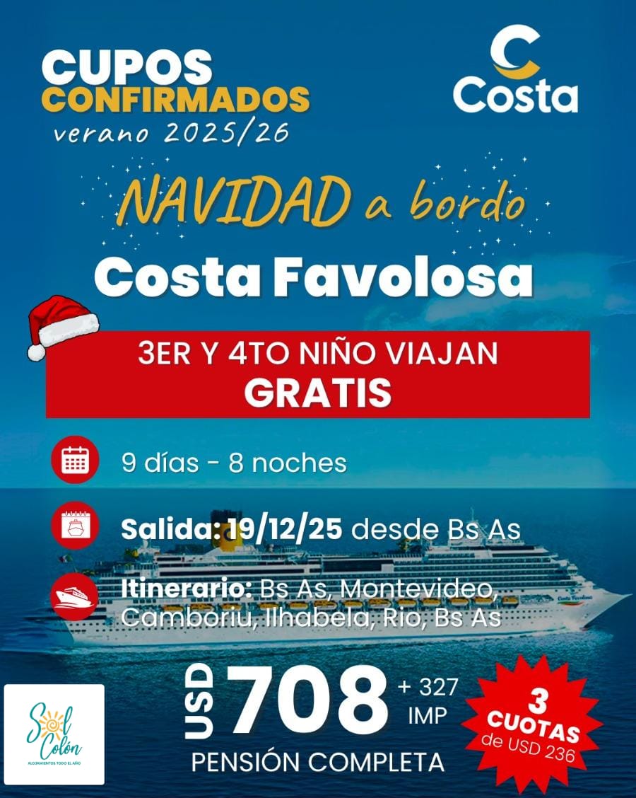 🎄 ¡Viví una Navidad inolvidable en altamar! Subite al majestuoso Costa Favolosa y disfrutá de unas fiestas diferentes, rodeado de confort, diversión y destinos increíbles.